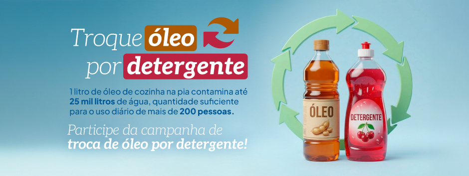O descarte correto do óleo de cozinha ajuda a preservar a água e o meio ambiente. Pensando nisso, participe da nossa campanha: traga seu óleo usado e troque por detergente!